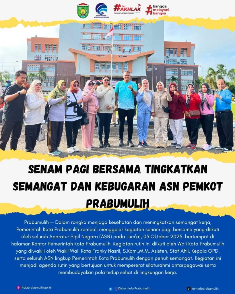 Prabumulih — Dalam rangka menjaga kesehatan dan meningkatkan semangat kerja, Pemerintah Kota Prabumulih kembali menggelar kegiatan senam pagi bersama yang diikuti oleh seluruh Aparatur Sipil Negara (ASN) pada Jum’at, 03