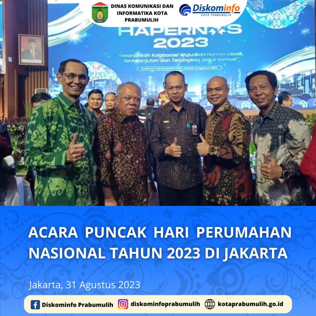 Walikota Prabumulih yang dalam hal ini diwakilkan oleh Asisten Bidang Pemerintahan dan Kesra Bapak Drs. Aris Priadi, M. Si yang didampingi oleh Kadinas Perkim Bapak Maiduty, M.Si. menghadiri acara Puncak Hari Perumahan Nasional Tahun 2023 di Jakarta.