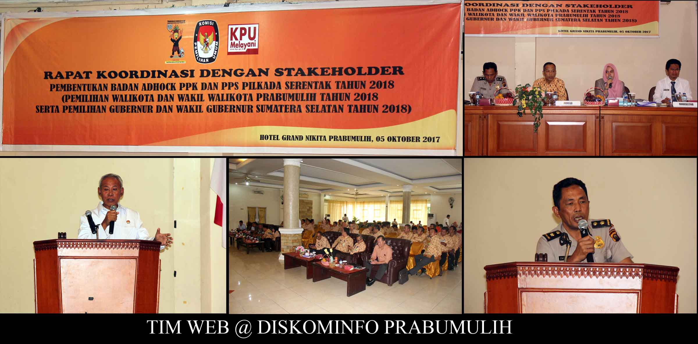 Prabumulih, Kamis 05 Oktober 2017 bertempat di Hotel Gran Nikita Prabumulih, berlangsung Rapat Koordinator Dengan Stakeholder Terhadap Rencana Pembentukan Badan Adhock PPK dan PPS Pilkada Serentak Tahun 2018 Pemilihan Walikota dan Wakil Walikota Prabumulih Tahun 2018 Serta Pemilihan Gubernur dan Wakil Gubernur Sumatera Selatan Tahun 2018. Kegiatan ini dihadiri oleh Asisten III Setda Kota Prabumulih H.Asymuni. Beliau bersama Pemerintah Kota Prabumulih turut mendukung kegiatan ini. Kedepan beliau berharap dapat bermanfaat untuk Pilkada serentak Tahun 2018. Tutupnya. Turut hadir Ketua KPU Prabumulih H.M.Tahkyul, Kapolres, Kepala Dinas, Kepala Badan, Kepala Bagian, Seluruh Camat dan lurah, serta tamu undangan lainnya. Sumber : Diskominfo Prabumulih.
