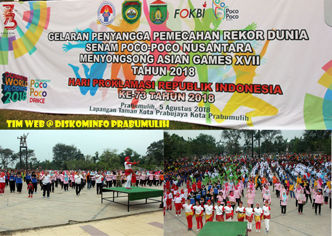 Prabumulih, Salah satu kota di Indonesia yang diikutsertakan dalam Pemecahan Rekor Dunia Senam Poco- poco nusantara tahun 2018 adalah Kota Prabumulih. Hari ini, Minggu 05 Agustus 2018 Ribuan masyarakat Prabumulih melakukan gerakan senam poco-poco yang digelar di Taman Kota Prabujaya kecamatan Prabumulih Timur. Senam Poco-poco yang dipandu langsung oleh Instruktur walaupun di peragakannya sedikit berbeda dari versi aslinya karena ditambah dalam senam tersebut tarian khas dari berbagai daerah, namun antusias masyarakat sangat tinggi untuk mengikuti gerakan demi gerakan. Turut hadir dalam senam ini, PJ Walikota Prabumulih, H. Richard Chahyadi, Danyon Zipur 2 S/G, Danramil, Ketua Penggerak PKK, Seluruh Kepala OPD di lingkup Pemerintahan Kota prabumulih, Kepala Sekolah SD, SMP, SMA Se Kota Prabumulih serta Masyarakat yang sempat hadir.. (Sumber : Diskominfo Prabumulih).