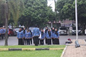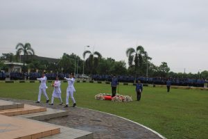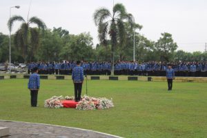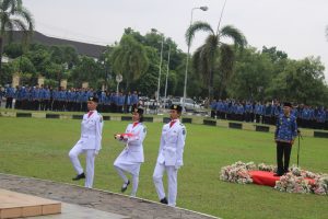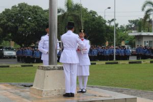 Upacara dimulai dengan pengibaran bendera Merah Putih yang diiringi dengan lagu kebangsaan “Indonesia Raya,” diikuti oleh seluruh peserta upacara dengan penuh penghormatan.