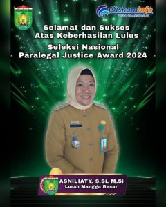 PRABUMULIH -Pemerintah Kota Prabumulih mengucapkan selamat dan sukses kepada Lurah Mangga Besar, Asniliaty, S.Si., M.Si atas keberhasilannya lulus Seleksi Nasional Paralegal Justice Award (PJA) 2024.