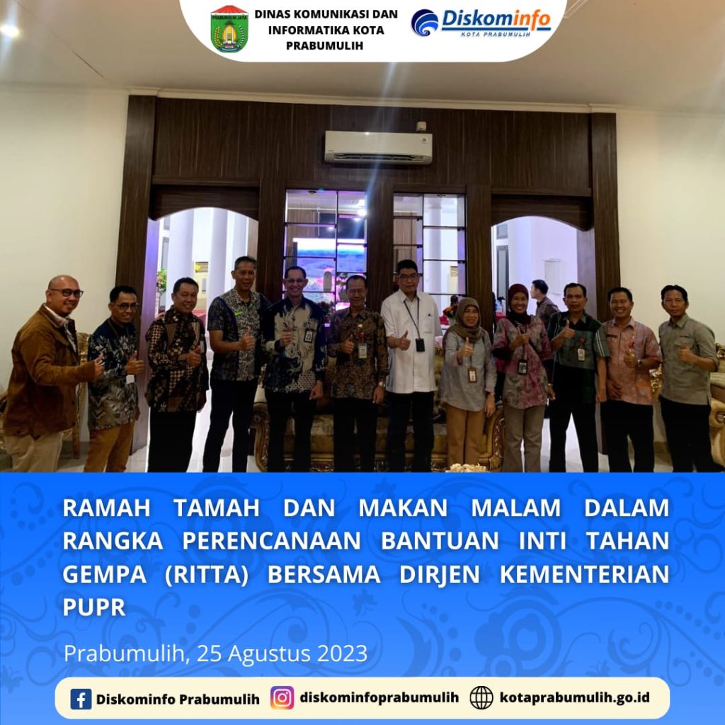 Setelah melakukan Penyerahan Bantuan Berupa Kunci Rumah Inti Tahan Gempa (RITTA) di Kelurahan Sukaraja Kecamatan Prabumulih Selatan, Sekretaris Daerah Kota Prabumulih H. Elman, ST, MM menjamu tamu dari Dirjen Kementerian Pekerjaan umum dan Perumahan Rakyat dan PT Sarana Multigriya Finansial (SMF) untuk menghadiri acara Ramah Tamah dan Makan Malam bersama dalam Rangka Pencanangan Bantuan Rumah Inti Tahan Gempa (RITTA) Bagi Kelompok Masyarakat Berpenghasilan Rendah di Kota Prabumulih dalam Rangka Memeriahkan Hari Perumahan Nasional (HAPERNAS) yang jatuh setiap Tanggal 25 Agustus, yang berlangsung di Guest House Rumah Dinas Walikota Prabumulih.