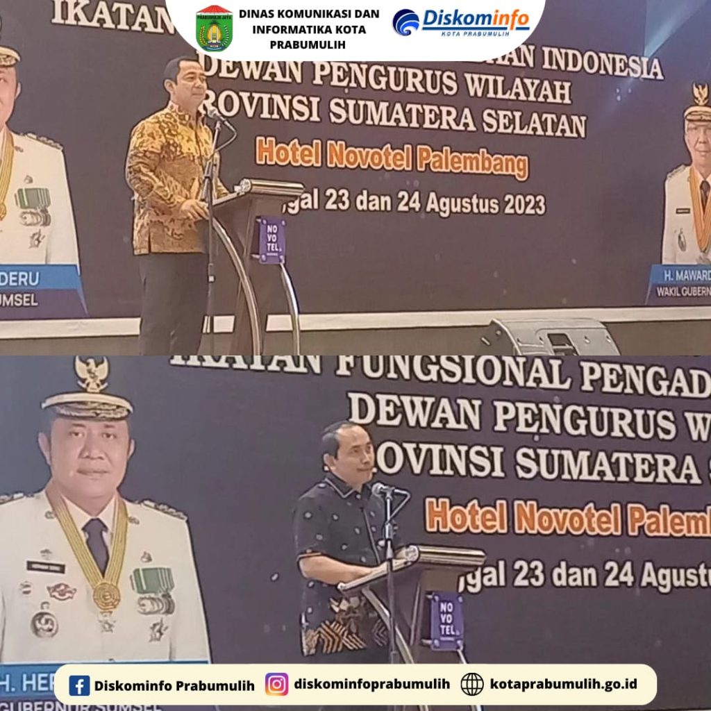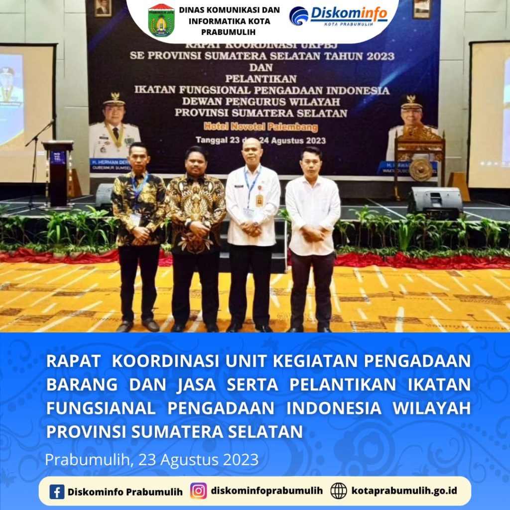 Walikota Prabumulih H Ridho Yahya diwakili Asisten I Pemerintah Kota Prabumulih Drs Aris Priadi SH menghadiri Pembukaan Rapat Koordinasi Unit Kegiatan Pengadaan Barang dan Jasa serta Pelantikkan Ikatan Fungsional Pengadaan Indonesia Wilayah Sumatera Selatan di Hotel Novotel Palembang, Rabu 23 Agustus 2023.