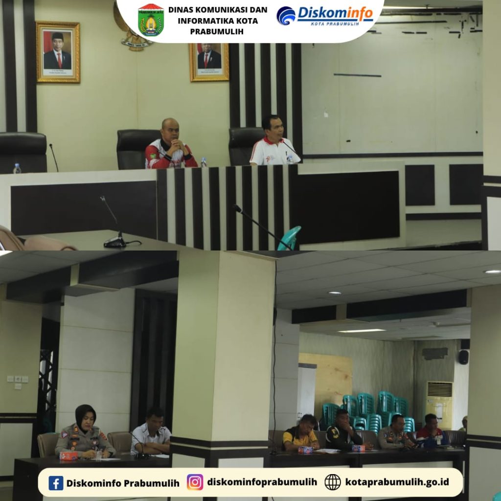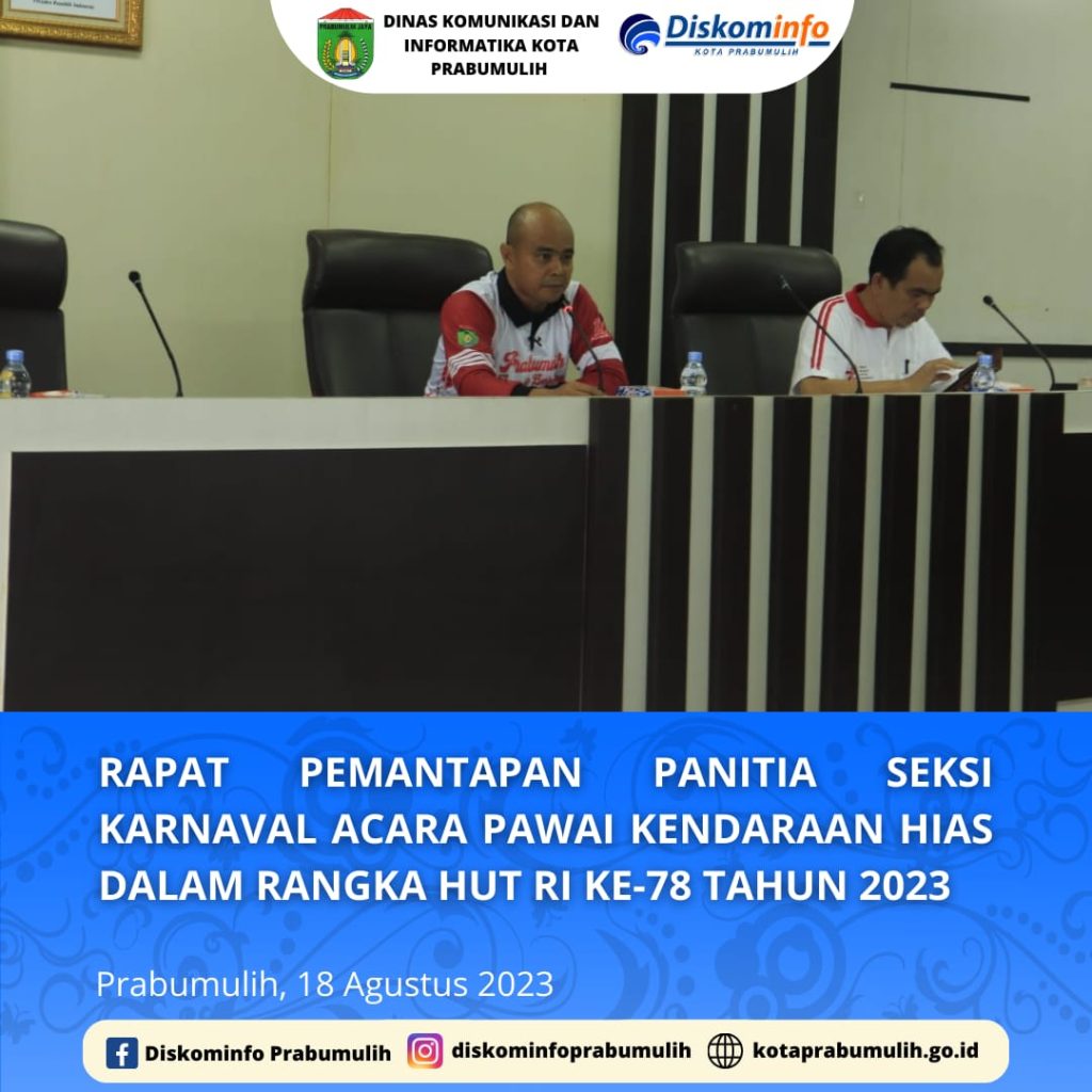 Walikota Prabumulih yang di wakili oleh Asisten 1 Pemerintah Kota Prabumulih Bidang Pemerintahan dan Kesra Drs. Aris Priadi, S.H., M.Si didampingi Kepala BAPPEDA Ir. Abu Sohib, M.SiMemimpin Rapat Pemantapan Panitia Seksi Karnaval Acara Pawai Kendaraan Hias dalam rangka HUT Ke-78 Republik Indonesia Tahun 2023.